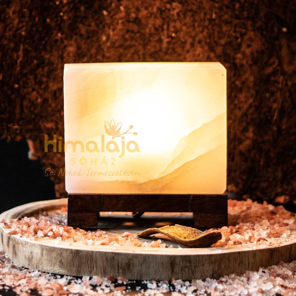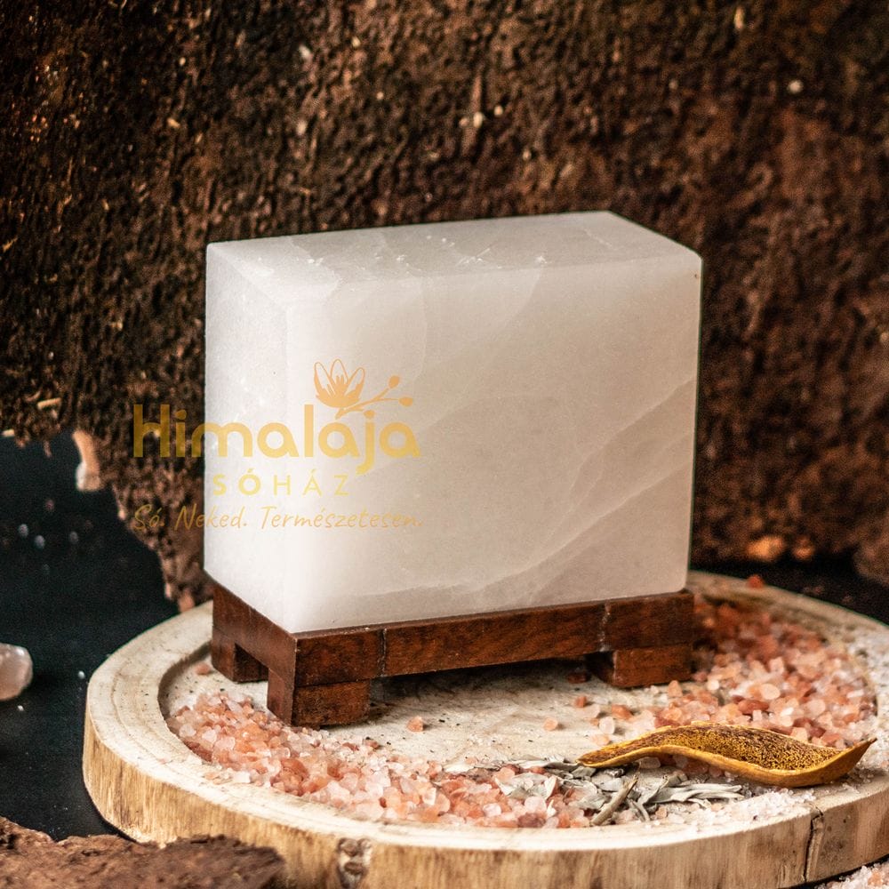Himalája Sólámpa – TÉGLAtest alakú fehér színű Himalája Sótömb, fa talpon rögzítve.
