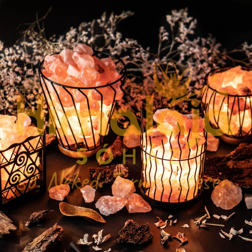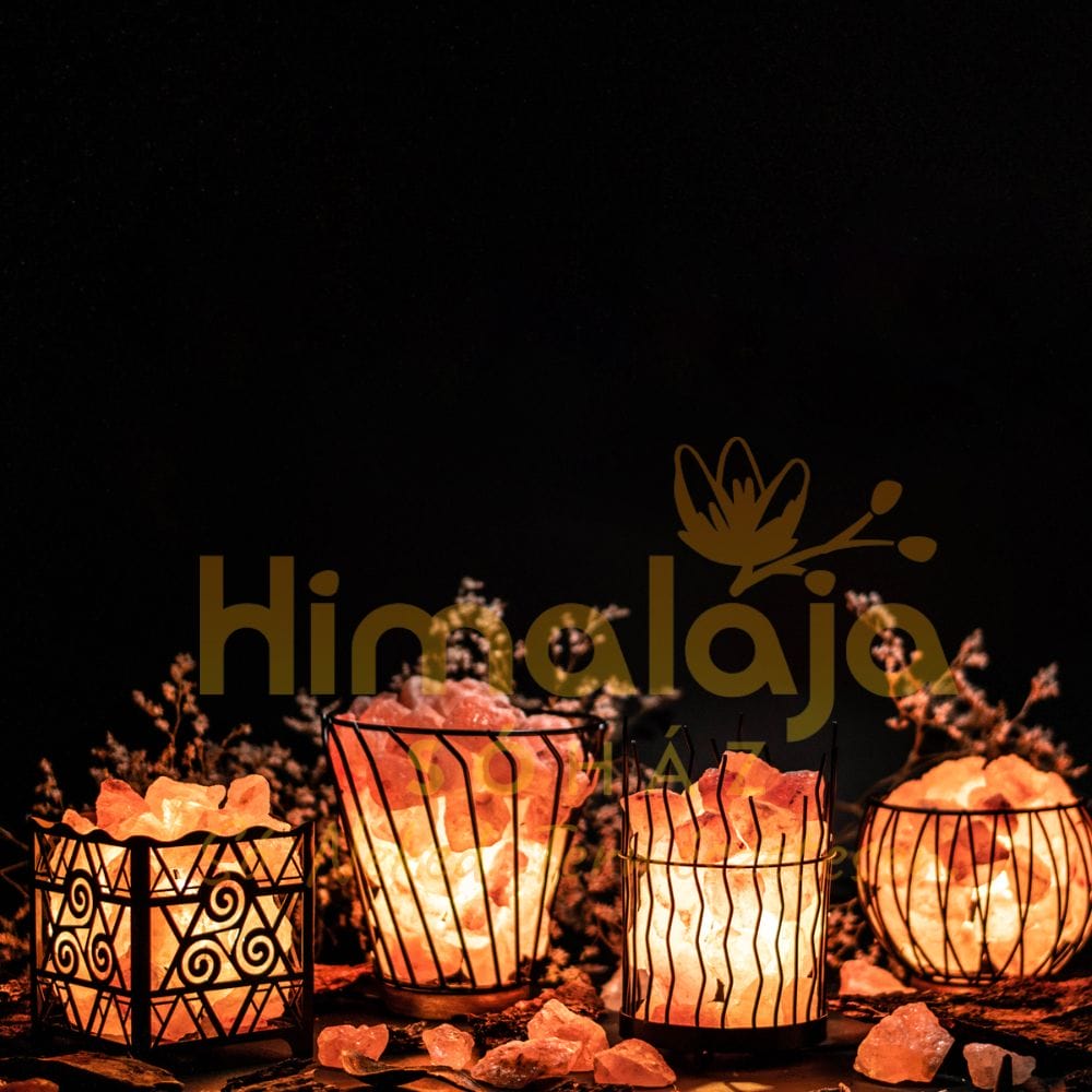 Himalája Sólámpa – Hullámos fém kosárban elhelyezett Himalája Sórögök.