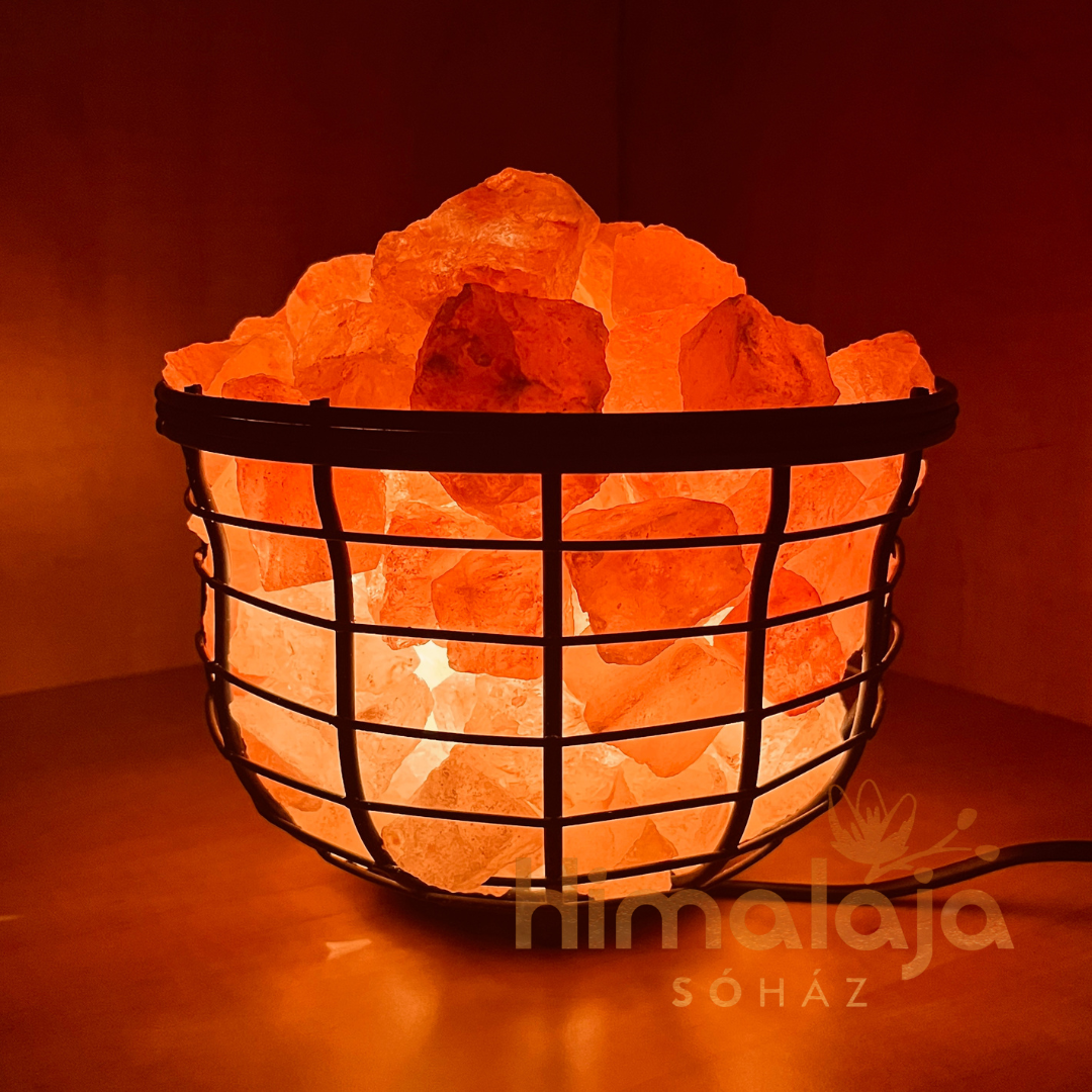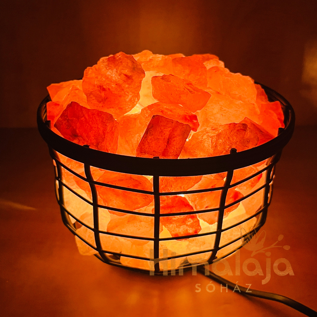 Himalája Sólámpa – kehely, tál formájú fém kosárban elhelyezett Himalája Sórögök.